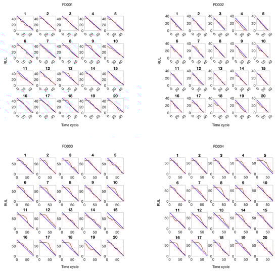 In this part, the data in the constant stage () is neglected, and only the data in the transition stage () and the linear degradation stage () is adopted. These data are then fed to a two-layer LSTM model with labelled RUL. Figure 9 plots the prediction result of the first 20 engines in the training dataset. Generally, the RUL prediction accuracy is relatively poor at the beginning and is in line with the ground truth when close to the failure point, which is in agreement with the result achieved in most literature, such as [1,29]. The most likely reason for this result is that the turning points between the constant and transition stages in different engines in the same dataset are also different. Although these engines suffer from the same operating and fault conditions, the degradation process would not be precisely the same due to other factors like the working environment.
