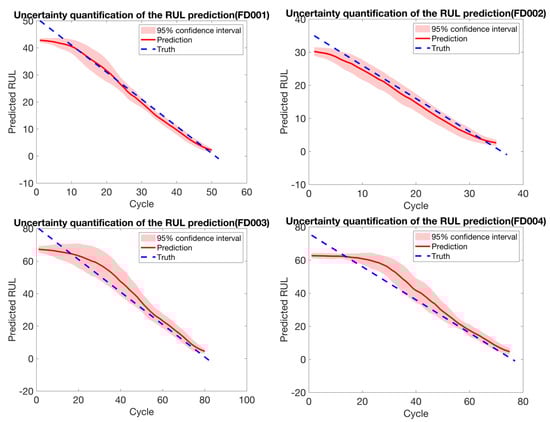 Figure 10 demonstrates the uncertainty quantification of the RUL prediction of all engines in the training set for each subset. It can be observed that the average RUL prediction, indicated by the solid curves, overall aligns with the ground truth. The pink area (indicating the 95% confidence interval) shows the decreasing trend of the uncertainty of RUL prediction following the increment of the lifecycle. The RUL prediction of the first two subsets outperforms that of FD003 and FD004 as they have only one fault condition.