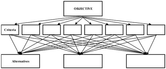 In the implementation phase of the AHP, first, the problem must be defined clearly and the objective in the problem must be determined. Starting with the objective, the main criteria, the subcriteria, and the lowest-level alternatives are established in a certain hierarchical structure. A hierarchical structure related to criteria and alternatives is constituted in accordance with the research topic, similar to the structure shown in Figure 2. The numbers of subfactors under each factor at the same level must be close to each other [].