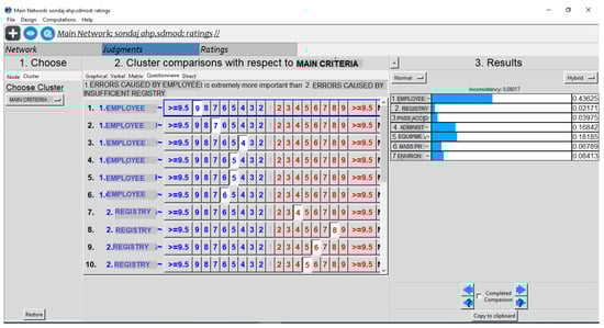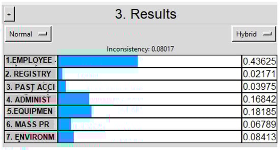 Step 4: After completing pairwise comparison questionnaires, the importance weight for each criterion was obtained. The consistency ratio was checked at each step. If it was higher than 0.10, the pairwise comparison conducted was revised and revaluated. Program screenshots for the consistency ratio is shown in Figure 7.
