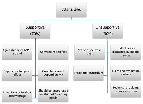 | “I personally have an agreeable attitude because I think mobile learning and teaching is an inevitable trend.” “It assists teaching and exceeds traditional means of teaching.” “Too much interference with the use of technology. Students are easily distracted by mobile devices.” | Attitudes | |