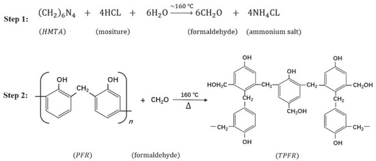 The PFR and HMTA were used to be the modifier to produce hard-grade asphalt based on recycled asphalt in this study. The molecular formula of PFR is with CAS No: 9003-35-4, categorized as phenol and formaldehyde and the role of solid products. It is a thermoplastic phenolic solid resin and only melts when heated at about 145~155 and cannot be changed to an insoluble and infusible state [22]. HMTA is a curing agent for PFR and the molecular formula is with CAS No: 100-97-0. After the addition of HMTA, PFR can be converted into thermosetting phenol formaldehyde resin (TPFR), in the amount of phenol (molar) more than the amount of aldehyde (molar) and acidic catalyst conditions. Reactions that take place in this process are shown in Figure 1.