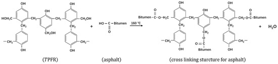In the curing reaction for PFR (Step 2 in Figure 1), multiple PFR molecular fragments are cross-linked to become TRFP [23]. The TPFR changes to an insoluble and infusible state after being heated, and it is acid-resistant, alkali-resistant and heat-resistant. More importantly, TPFR has more reactivity to interact with polar components in asphalt and consequently increases the physical interaction between asphalt molecules. Acidic groups (-COOH) can be most likely functional groups that react with TPFR. Thus, while modifying asphalt with TPFR, Pyshyev et al. [22] assumed the reaction as shown in Figure 2.