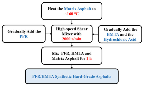 The preparation process of PFR/HMTA-modified hard-grade asphalt includes five steps, as shown in Figure 3. First, heat the matrix asphalt to about 160 °C, which is slightly higher than the melting point of 150 °C for PFR. Second, transfer the hot matrix asphalt to the high-speed shear mixer and keep it heated. The shear speed is set as 2000 r/min. Third, gradually add the PFR into the matrix asphalt being sheared through the feed port of the high-speed shear to avoid agglomeration in the asphalt. Fourth, gradually add the HMTA and the hydrochloric acid to the matrix asphalt. Finally, continually mix PFR, HMTA and matrix asphalt in a high-speed shear mixer for 1 h to obtain PFR/HMTA synthetic hard asphalt.
