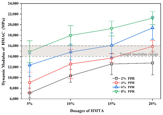 Considering the generalized application requirements of HMAC, the minimum value of its dynamic modulus should be greater than 14,000 MPa (at 15 °C and 10 Hz) according to the French standard NF P98-140 for high modulus concrete [43]. Besides, the statistical data of Wang et al. on the actual dynamic modulus of HMAC in existing highway pavements showed that the upper quartile value of this statistical interval was 16,000 MPa [44]. Therefore, dosages of PFR/HMTA are determined based on the following: the dynamic modulus of the HMAC which used PFR/HMTA modified asphalts as binder should be in the range of 14,000~16,000 MPa at 15 °C and 10 Hz.