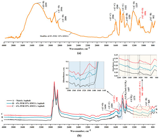 FT- IR spectra for the modifier of 4%PFR/15%HMTA (a) and synthetic hard-grade asphalts (b).