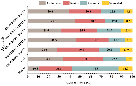 Results of SARA fraction analysis for five synthetic hard-grade asphalts and TLA (the control sample) are shown in Figure 7, which were obtained by the TLC-FID. Three synthetic asphalts with 4% PFR/15% HMTA, 4% PFR/20% HMTA and 6% PFR/15% HMTA processed larger asphaltene ratios and smaller resins ratios than TLA, which should be caused by the high additions of HMTA in them. Compared with them, SARA fraction compositions of synthetic asphalts with 6% PFR/10% HMTA, and 8% PFR/5% HMTA were closer to that of TLA. However, their asphaltene ratio was a little lower than that of TLA. Synthetic asphalts of 6% PFR/10% HMTA and 8% PFR/5% HMTA possessed higher saturated ratios than that of the other three and TLA. Previous studies indicated that a fraction saturated is the most unstable fraction in asphalts and it is highly susceptible to loss or conversion into other heavy fractions, such as asphaltene and resins during the aging process of asphalt [31]. This explains why the mass loss of these two samples after RTFOT was more than the other three and TLA.