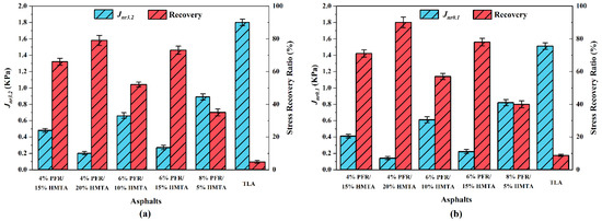 The Jnr and elastic recovery ratios of five synthetic hard-grade asphalts and the control sample at stress levels of 3.2 kPa (a) and 0.1 kPa (b).