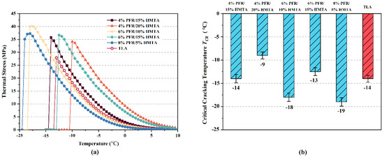 Figure 9a shows the development of the thermal stress during the cooling process of five synthetic hard-grade asphalts and the control sample, which was outputted by the NSCT. When the temperature reached critical cracking temperatures (), the accumulated thermal stress within the asphalt specimen was greater than its tensile strength. At this moment, cracking occurred rapidly in the asphalt specimen, while the thermal stress curve suddenly dropped to 0. Figure 9b shows the of all samples. The lower is desired to guarantee higher cracking resistance of hard-grade asphalt binders at low temperatures. The descending order of cracking resistance for these PFR/HMTA synthetic hard-grade asphalts based on the are 8% PFR/5% HMTA, 6% PFR/10% HMTA, 4% PFR/15% HMTA, TLA, 6% PFR/15% HMTA and 4% PFR/20% HMTA. The gap between the highest of 4% PFR/20% HMTA and lowest of 4% PFR/20% HMTA reached 10 °C. As observed, the maximum stresses before cracking are at least 22% greater in all five types of synthetic hard-grade asphalts than in TLA, which indicates that the low-temperature strength (tensile) of synthetic asphalt has been improved. However, the growth rates of thermal stress with cooling were greater for the three samples with 15% and 20% HMTA addition than for TLA, which indicates that the deformability of these three synthetic asphalts at low temperatures is lower than that of TLA. Accordingly, although their low-temperature tensile strength performed well than TLA, their were higher than TLA due to the larger rate of thermal stress accumulation. Compared with these three, the two samples with 5% and 10% HMTA additions not only have greater low-temperature tensile strength, but also have a significantly lower rate of thermal stress accumulation with cooling than TLA. On the basis of these results, one can conclude that the modifiers of PFR and HMTA can improve the low-temperature tensile strength of asphalts, but the higher the addition of HMTA, the worse the deformation capacity of asphalts at low temperatures.