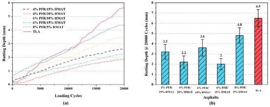 The results of HWTT for six HMACs which used the five PFR/HMTA modified asphalts and the control asphalt TLA as binders are shown in Figure 10. For each sample, three replicate tests were conducted. Figure 10a displays the rutting depth increased with the wheel loading cycles for these six HMAC samples in one set of tests. In five samples of PFR/HMTA-HMAC, rutting depths increased almost linearly with loading cycles. However, in the sample of TLA-HMAC, rutting depths increased rapidly in the first 5000 loading cycles, about 40% of total rutting depths occurred in this stage. In the following 15,000 loading cycles for TLA-HMAC, the growing rate of rutting depths declined slightly but it was also above that of the 8% PFR/5% HMTA which had the large growth rate among the PFR/HMTA-HMAC.