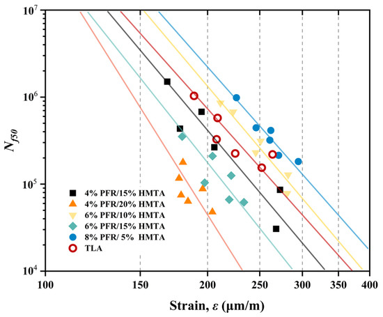 Poor resistance to fatigue cracking is a general shortcoming of high-modulus asphalt concrete, and many studies attempted to solve this problem. For HMAC using synthetic hard-grade asphalts as binders, their fatigue resistance should be at least better than that of those traditional hard-grade asphalts. Figure 11 shows the results of 4 PB fatigue tests for five PFR/HMTA-HMAC samples and the control of TLA-HMAC. The regressed curves (Wöhler fatigue curves) for all samples are also displayed in it and the parameters of corresponding curves are listed in Table 6.