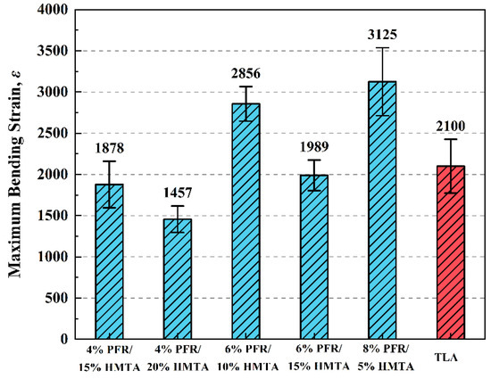 The descending order of fatigue resistance for these HMAC based on are 8% PFR/5% HMTA, 6% PFR/10% HMTA, TLA, 4% PFR/15% HMTA, 6% PFR/15% HMTA and 4% PFR/20% HMTA. In some European countries, the parameter of high-modulus asphalt concrete must be greater than 130 [42]. Obviously, the HMAC samples of 4% PFR/20% HMTA cannot satisfy it, and the 6% PFR/15% HMTA just crossed this threshold. Compared with them, the of two samples with 5% and 10% HMTA were about 69.2% and 61.5% above this threshold, and they were also about 23.1% and 17.9% above the sample of TLA. Slopes of curves for 6% PFR/15% HMTA, and 4% PFR/20% HMTA are large than other curves, which means a strong sensitivity for the fatigue life to strain in these two samples. This slight increase in the strain (corresponding to heaver vehicle load cycles or thermal cycles with large temperature gaps) may lead a significant decrease in the fatigue life of pavements [24]. All of these indicate that the dosage of HMTA in the asphalt should avoid exceeding 15% to ensure enough fatigue resistance of the HMAC.