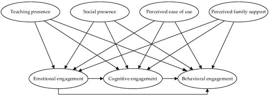 Teaching and social presence subscales were adapted from the subscales of the community of inquiry instrument []. The items for measuring the perceived ease of technology use were adapted from the instrument validated by Venkatesh et al. []. Regarding measures of family presence for online learning, based on actual situations, in this study we finally determined four items including the availability of learning equipment, materials, and places. Online learning engagement for sharing was evaluated by Sun et al. [], who measured three types of engagement: behavioral engagement, emotional engagement, and cognitive engagement.