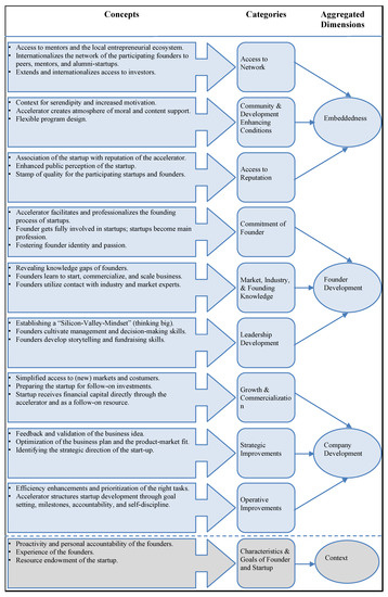 For the analysis, we followed [22] by using a systematic inductive approach that follows the empirical material closely at any time. As a starting point, we examined the complete transcripts of the interviews, from which we extracted terms, phrases and statements that seemed meaningful. We then coded them and developed concepts, categories and dimensions. During this process, we used our theoretical background knowledge about accelerators, as it helped to expand the repertoire to interpret the data [63].