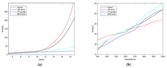 When the number of items increases, the amount of data to be traversed by the algorithm increases. Therefore, as shown in Figure 6a, the run time of the algorithm generally increases. However, it can be seen that the AP-ACO algorithm has the smallest change compared with other algorithms, so the proposed method can maintain good mining efficiency under the commonly used number of items setting. In the practical production and service activities, the operation efficiency of the method will not change significantly with the increase in the number of projects in the enterprise business, which is conducive to the expansion of the enterprise business. At the same time, with the accumulation of enterprise service data, the number of transactions continues to increase. Although the increase in data volume is conducive to the accuracy of data mining results, it will also increase the computational pressure of the algorithm. Therefore, the running time of the algorithm in Figure 6b increases with the increase in the number of transactions. However, the method in this paper still has certain advantages. Therefore, the method in this paper can effectively adapt to the update of enterprise production service data, which is helpful to improve the quality of product demand.