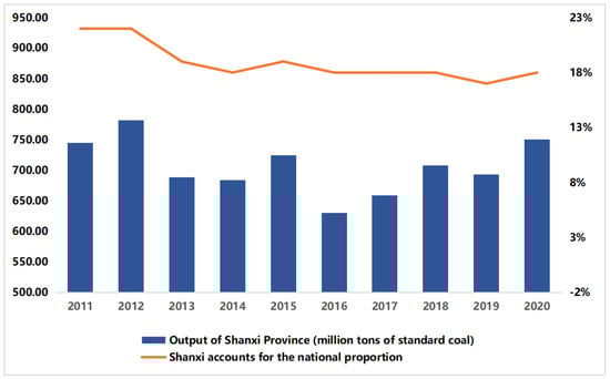 Figure 1. The primary energy production of Shanxi in recent years and its proportion of China’s total.