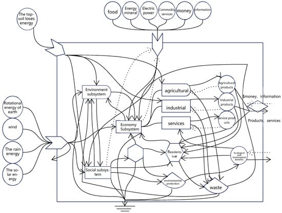 According to H. T. Odum’s standard energy flow diagram, combined with the characteristics of Shanxi Province’s ecological and economic system, a flowchart of the regional emergy was drawn, as shown in Figure 3.
