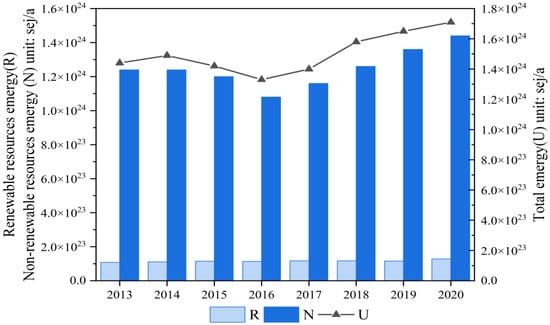 Figure 4. Trend chart of basic emergy in Shanxi Province from 2013 to 2020.