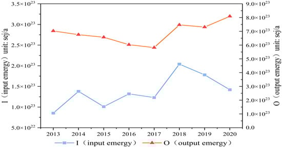 Figure 5. Trend chart of input and output emergy values in Shanxi Province from 2013 to 2020.