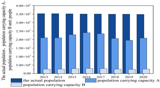 Figure 6. Actual population and population carrying capacity in Shanxi from 2013 to 2020.