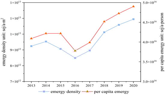 Figure 7. Emergy density and per capita emergy usage in Shanxi Province, 2013–2020.
