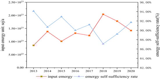 Figure 8. Trend chart of emergy self-sufficiency rate and input emergy quantity in Shanxi Province from 2013 to 2020.