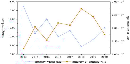 Figure 9. Emergy yield rate and emergy exchange rate in Shanxi from 2013 to 2020.