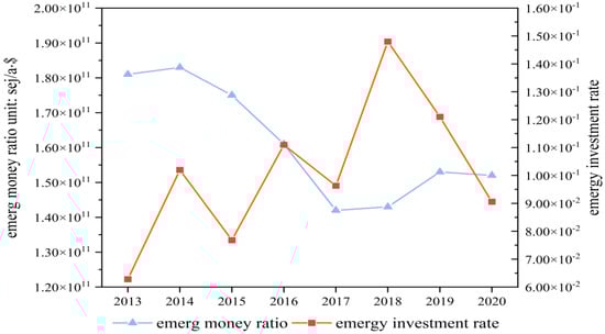 Figure 10. Emergy money ratio and emergy investment rate in Shanxi from 2013 to 2020.