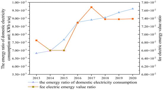 Figure 11. The emergy ratio of domestic electricity consumption and the fee electric emergy value ratio in Shanxi Province in recent years.