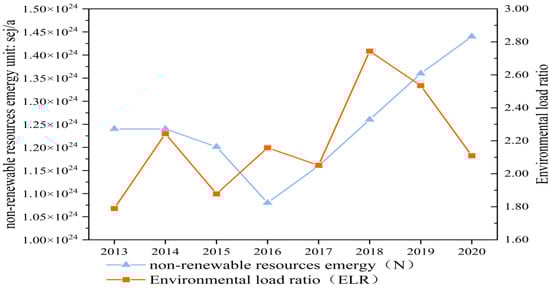 Figure 12. Trend chart of non-renewable resource emergy value and environmental load rate in Shanxi Province from 2013 to 2020.