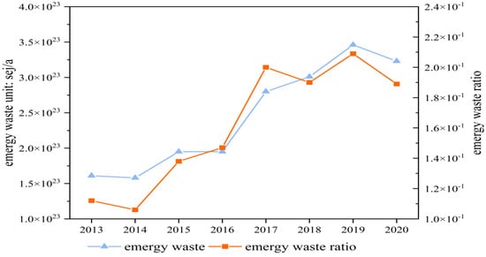 Figure 13. Trend chart of waste emergy and waste emergy ratio in Shanxi Province from 2013 to 2020.