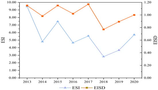 Figure 14. Trend of ESI and EISD values in Shanxi Province from 2013 to 2020.