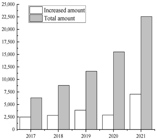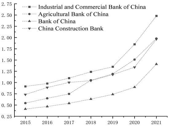 According to Data from China Statistical Yearbook, China Research Data Service Platform and other relevant databases, the green finance index of China’s provinces and regions is currently rising year by year, with Beijing having the largest increase, from 0.19 in 2001 to 0.84 in 2020; green credit in the market accounts for 90% of green financing. By the end of 2021, the total balance of green loans in China was CNY 15.9 trillion, 12.7% higher than the end of 2020; in addition, funds invested in carbon emission reduction and other green loan projects accounted for 67% of the green loan balance, taking into account the four major state-owned banks, Bank of China, Agricultural Bank of China, Industrial and Commercial Bank of China and China Construction Bank. We used the following Figure 1 to show the table of green credit of the four major banks during 2015–2021: green bonds, green funds, green insurance, carbon finance, etc. Accounting for only 10% of green financing, green bonds currently have a stock size of CNY 1.16 trillion and the number of issues is about 560, with a year-on-year growth of more than 100%. Green insurance mainly contributes to the development of low-carbon agriculture, with the amount of green insurance close to CNY 45 trillion in the past three years.