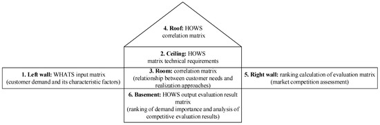 - Basement: represents how to output the evaluation result matrix, which represents the application of quantifiable technical methods to realize customer needs and the ranking results of the importance relationship between customer demand factors.