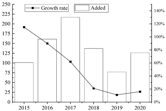 According to the data of China Securities Investment Fund Association, as of the end of the third quarter of 2021, the number of public and private funds in the direction of green, sustainable and ESG was close to 1000, with a combined scale of more than CNY 790 billion; an increase of 36% over the scale at the end of 2020. Among them, there were more than 190 public funds, with a management scale of more than CNY 410 billion, and 800 private funds, with a management scale of CNY 370 billion, 90% of which were equity venture capital funds. Divided by green fund investment areas, the number of newly established and filed green funds invested in ecological and environmental protection in 2020 was 38, accounting for 30%; 86 were invested in low-carbon and energy-saving areas, accounting for 68%; and 2 were invested in circular economy areas, accounting for 2%. Figure 6 below shows the number of new green funds and their growth rate from 2015 to 2020.