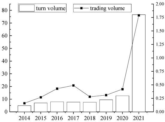 According to data from the Chinese Ministry of Ecology and Environment, by the end of 2021, China’s carbon emissions trading had nine pilot regions, including Beijing, Tianjin, Shanghai, Chongqing, Hubei, Guangdong, Shenzhen, Sichuan and Fujian, and the pilot regions had carried out innovative practices such as carbon bonds, carbon funds, green structured deposits, over-the-counter swaps of carbon allowances, carbon borrowing transactions and carbon quota forwards. The national carbon emission trading market has been active since 16 July 2021, and as of 15 July 2022, the cumulative volume of carbon emission allowances traded reached 194 million tons, with a cumulative turnover of CNY 8.492 billion. Figure 7 below shows the turnover and trading volume of China’s carbon trading market from 2014–2021.
