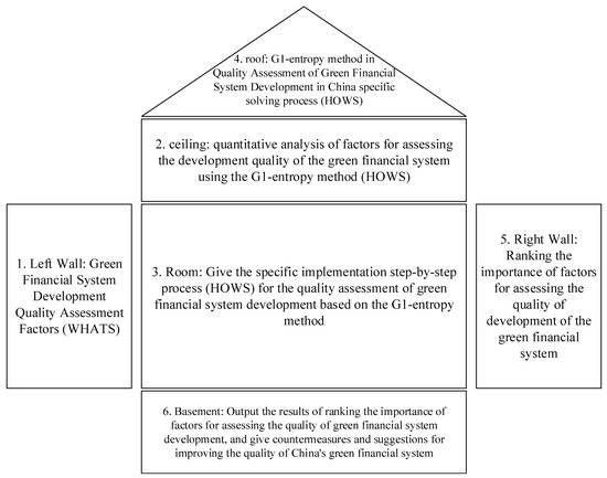 We designed a general process for assessing the development quality of the green financial system based on the green financial development assessment quality house in Section 5.1, as shown in Figure 9 below.