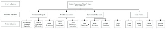 This study focuses on the quality assessment of the development of green financial system in the context of double carbon, and there is no perfect indicator assessment system for green finance issues. Therefore, we considered in this study that the green financial system includes government support, social awareness, and environmental resources in addition to green finance, so we combined the principles of scientificity, systematicity, and data availability to construct this paper’s green financial system construction quality assessment index system from four dimensions: government support, social awareness, environmental resources, and green finance.