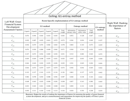 A sound green financial system and the promotion of ecological civilization are important tasks for the Chinese government to achieve sustainable economic development, as well as a necessary path for countries around the world to achieve carbon neutrality and carbon peaking. In addition, whether green finance can truly contribute to the promotion of sustainable economic development is inseparable from quantitative and effective assessment tools. We have compiled the current research on green finance quality assessment by scholars, and it can be seen that the existing research directions are very rich. The research literature is currently focused on global and national green financial development quality assessment and corporate green development quality assessment analysis. In terms of global green financial development quality assessment, Melnyk, T et al. developed a complete methodology to revise the System of Environmental-Economic Accounting (SEEA) established by the UN methodology by comparing existing methods with statistical assessment of the state of the green economy and green growth potential [27]. The study of Shkola, V et al. was based on green projects, environmentally damaging projects, environmentally neutral projects and mixed projects and calculated a sustainability index, resilience index, and risk (including country risk) to improve the accuracy of the assessment [28]. The current indicators for macro green financial development quality assessment are mostly focused on environmental protection and damage factors, while the highlights of the research specifically on green financial indicator systems are less obvious, and we will focus our research on this issue. In terms of practical country cases for assessing the quality of green finance development, Adjei-Bamfo, P et al. proposed a novel evaluation framework for environmentally sustainable human resource management in the context of developing economies and local government organizations [29]. The study of Wasan, P et al. explored the barriers and strategies for promoting green finance development in India. Policy barriers, economic barriers, and knowledge barriers were found to be the three major barriers to green finance adoption, and an environmental policy and risk assessment framework was identified [30]. Their study used quantitative analysis to identify country-specific barriers to green finance development and give policy recommendations; unlike them, we will add qualitative analysis factors to construct a system of indicators to assess the quality of green financial system development. The study of Lv, CC et al. uncovered the construction of a policy-oriented and market-based green finance development index system and used the entropy–weight method to calculate the green finance development index and to reveal the evolutionary trends and root causes of the green finance development gap in China [31]. Interestingly, we also used China as a case study, and their study can inform our own. In terms of quality assessment of corporate green development, Chygryn, O et al. examined stakeholders’ evaluation of green competitiveness effects in five dimensions: consumer satisfaction with green goods, green product production efficiency, green product quality and cleaner production, institutional cooperation, and community impact [32]. Han, MN et al. showed that analyst coverage can significantly improve firms’ green innovation performance and encourage managers to promote green investments with a long-term perspective [33]. The study of Sellitto, MA proposed a model based on three constructs: green strategy, green innovation, and green operations, organized in 16 categorical indicators, prioritized using hierarchical analysis, and evaluated by three practitioners from each focal company for indicator completion [34]. Similar to their study, we also ranked the indicators in terms of importance. Their study can provide a reference for us to construct the indicator system, but in terms of methodology we improved the traditional hierarchical analysis method and proposed to apply the G1 method for subjective assignment. In terms of quality assessment in the context of green supply chain management, although deviating from our study, we consider it an interesting research topic. Thanki, S and Thakkar, J proposed a fuzzy decision test and evaluation laboratory method incorporating an analytical network process for assessing lean and green performance of supply chains [35]. Khan, SAR and Yu, Z provided an experimental assessment of the impact of in-house environmental management and green information systems on green supply chain practices, providing a policy framework for manufacturers, regulators, and legislators [36]. Notably, their study also illustrates the necessity and importance of government green policies for green development and provides a theoretical basis for our study. This part of the study mainly deals with the aspect of green financial system evaluation indicators by domestic and foreign scholars, who use energy, environmental protection, and risk as part of evaluating the green financial system, and our present study will further expand the evaluation indicators of green financial quality in China to provide a deeper methodological support for similar international academic studies.