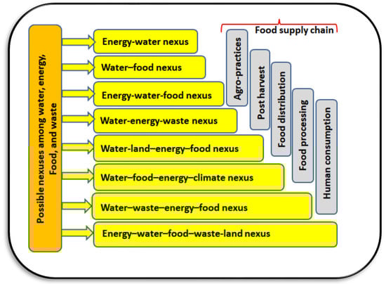 - Couto, L.C.; Campos, L.C.; da Fonseca-Zang, W.; Zang, J.; Bleischwitz, R. Water, waste, energy and food nexus in Brazil: Identifying a resource interlinkage research agenda through a systematic review. Renew. Sustain. Energy Rev. 2021, 138, 110554. [Google Scholar] [CrossRef]