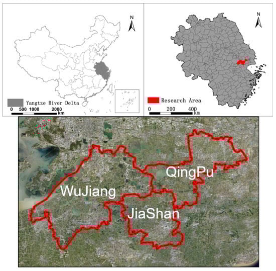 The Yangtze River Delta is not only the most dynamic, economically advanced and urbanized area in China [26], but also an important intersection area of the Belt and Road Initiative and the Yangtze River Economic Belt. The integrated regional development of the Yangtze River Delta has become a national strategy [27]. Outline of the Integrated Regional Development of the Yangtze River Delta clearly identifies Qingpu District in Shanghai, Wujiang District in Jiangsu and Jiashan County in Zhejiang as the demonstration zone of green and integrated ecological development of the Yangtze River Delta, providing strong support for regional policy formulation and synergistic firefighting and rescue there. General Plan for Territorial Space of the Demonstration Zone of Green and Integrated Ecological Development of the Yangtze River Delta published in June 2020 proposed to integrate the “two districts and one county” whose total administrative area reaches over 2300 km2 for territorial space planning. In this study, the demonstration zone of green and integrated ecological development of the Yangtze River Delta is selected as the research area, and its geographical location is illustrated in Figure 1.