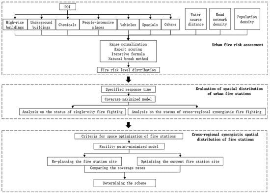 In this study, the layout of cross-regional fire stations was optimized with the aid of ArcGIS based on the assessment of regional fire risk and the evaluation of fire station layout. The optimization flowchart is presented in Figure 2. First, the POI points collected in the research area were classified according to different fire risk factors. Meanwhile, considering population density, road density and water source distance, the regions with fire risk were weighted on the ground of range standardization, iterative formula and expert scoring, and the fire risk in the research area was divided into three levels (high risk, medium risk and low risk) using the natural break method. Furthermore, the response time of fire stations was specified in accordance with the fire risk level, and the respective fire station coverage rates of Qingpu District, Wujiang District and Jiashan County and the overall fire station coverage rate of the YRDIDZ were investigated using the coverage-maximized model in ArcGIS. Finally, two optimization schemes were proposed according to the facility-minimized model, and their coverage rates were compared. In this way, an optimization strategy for the spatial distribution of fire stations was formulated for cities in the YRDIDZ.