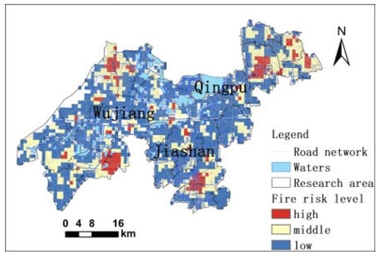 The ranges of primary and secondary indicators of urban fire risk are standardized. Subsequently, since different factors may exert varying effects on the fire risk, experts are invited to weight them according to the actual situation of urban fire risk in the research area (Table 2). Afterwards, the weighted indicators are brought into the iterative formula to calculate the fire risk distribution in the research area (Figure 3). Specifically, the research area is divided into 1935 regions which are then classified into three levels (163 high-risk regions, 539 medium-risk regions and 1233 low-risk regions) using the natural break classification method.