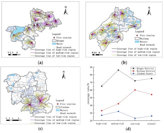 Maximized coverage of fire stations in single administrative areas. (a) Maximized coverage in Qingpu District; (b) Maximized coverage in Wujiang District; (c) Maximized coverage in Jiashan County; (d) Coverage of fire stations in single administrative areas.