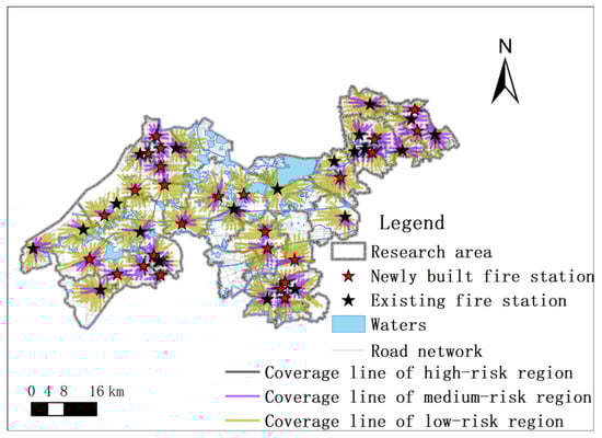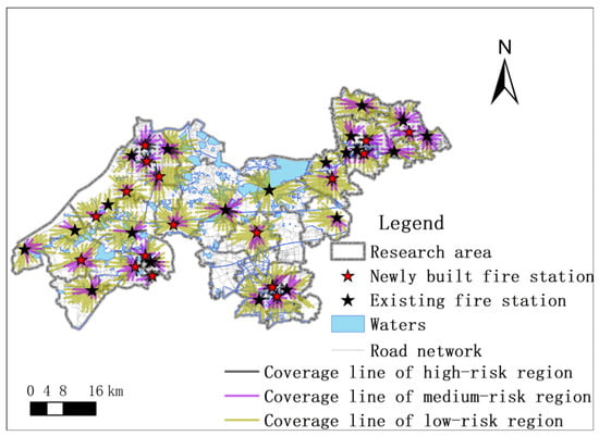 In the selection of a candidate location for a fire station, full consideration should be given to nearby facilities such as hospitals, schools, kindergartens, nurseries, theaters, shopping malls, sports venues and exhibition halls, as well as units with hazardous chemicals. On the premise of maximizing the coverage of high-risk regions in the research area, the distribution of newly built fire stations is explored and the coverage of medium- and low-risk regions is analyzed.