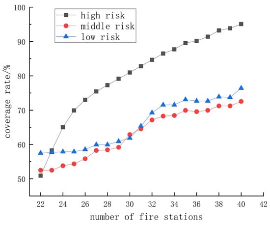 In order to obtain the reasonable number and location of fire stations, the maximum coverage model is used to simulate the increase of 1–19 fire stations respectively. The simulation results are shown in Figure 8. When the number of fire stations is 38, that is, when 17 new fire stations are added, the coverage rate of high fire risk areas exceeds 90%, and the coverage rate of medium and low risk areas exceeds 70%, which can better meet the fire risk prevention and control needs of the Yangtze River Delta integration demonstration area. The specific distribution location is as shown in Figure 9, with 4 new fire stations in Qingpu District, 10 new fire stations in Wujiang District and 3 new fire stations in Jiashan County. It is noteworthy that since cities are continuously developing complex systems, their fire station distribution concerning fire risk also deserves continuous exploration.