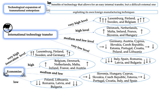 Figure 4 illustrates the basic pattern of technological expansion of transnational corporations [53,54] and the classification system of European countries according to international TT and innovative economies [55].