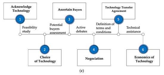 This concept of TT has also been introduced in the context of the exchange or relocation of personnel, or the exchange of particular competences and technical skills [32]. Shifting technology from advanced to emerging countries, from laboratory to industry, or from one field to another, are also forms of TT. From a more restrictive perspective, when technology is defined strictly as information, TT is regarded as information implementation into practical application [33,34].
