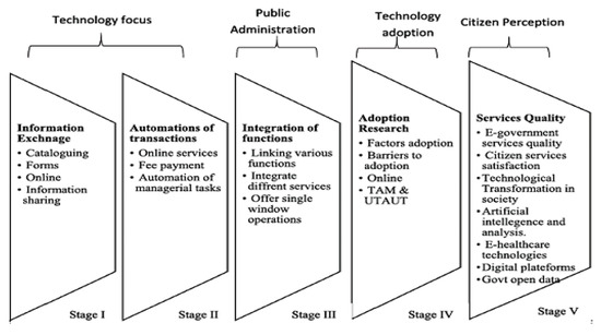 Moreover, Ullah, et al. [23] has classified the e-government evolution into five stages shown in Figure 2. The first and second stage focus on technology. The first stage is related to information exchange by adopting modern ICT facilities. The second stage is relevant to the automation of financial transactions. The focus of the third stage is public administration-related matters as it emphasizes on delivering government services, shared information, and administrative reforms. E-government research turned toward technology adoption in the fourth stage as it focuses on adoption methods and barriers to adoption. Fifth stage of e-government is about citizen perceptions e.g., service quality, online services, and technological transformation and digital platforms.