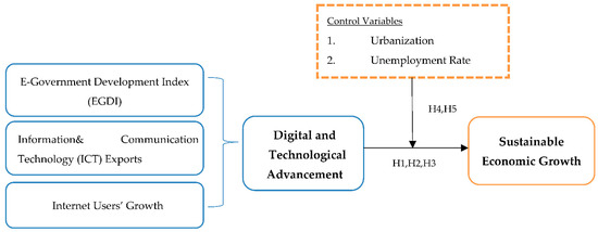 Numerous definitions of digital and technological advancement have been recommended over time. Digitalization was defined by [21] as the influence of digital media on modern social life and digital communication. Digital and technological advancement integrates digital technologies in industry and produces financial development. It can be defined from an alternative viewpoint to grow business in a digital environment. It can also be defined as to transform communications, interactions, business models, and business functions into digital data, which is generally compacted into a mixture of the physical and digital, e.g., industrialization of production or integrated marketing with a mix of manual and semi-autonomous operations, Omni-channel customer service, electronic services, and autonomy, etc. Cultural change is obligatory for the digital and technological transformation, as it mainly depends on human resources rather than digital technology. Digitalization can be also described as “the workforce works differently” [2]. Also, Georgescu, et al. [2] discovered how digitalization has influenced economic growth. The dataset was based on Eurostat and the World Bank. Results showed that digitalization affected economic growth by 70.33% with a correlation of 0.800. Besides that, Brodny and Tutak [18] measured the impact of the level of digitalization on economic growth amongst enterprises of EU-27 countries. It was suggested that EU-27 member states should take a decisive approach to financing R&D activities. Further, Hosan, et al. [16] established the link amongst digitalization, energy intensity, demographic dividend, and sustainable economic growth from 1995 to 2018 for 30 developing countries. Digitalization was measured by internet users’ growth and its impact was found positive on per capita GDP. The association between E-government Development Index (EGDI), ICT exports, internet users’ growth, urbanization, and unemployment rate with sustainable economic growth is further explained with the support of relevant literature.